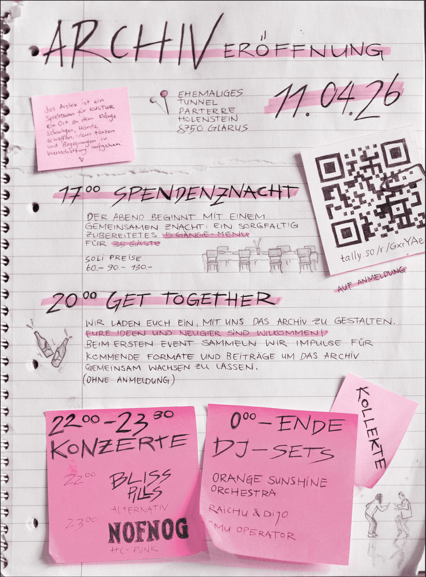 Am 11. April wird der neu gegründete Verein das «Archiv» vorstellen und feierlich eröffnen. Auf dem Programm stehen ein Spendenznacht, Ideen-Austausch, Konzerte (Bliss-Pills und Nofnog) und DJ-Sets (Orange Sunshine Orchestra, Raichu & DiJo und Smu Operator), dazu gibts flüssige Köstlichkeiten vom Bartresen.